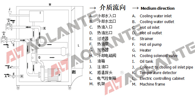 傳熱媒體(油)通過I(油箱)進入系統,由F(循環油泵)打到模具后再回到系統,周而復始。媒體(油)在經過G(加熱器)升溫,由K(感溫探頭)探測媒體(油)溫度,當溫度達到要求時,G(加熱器)停止工作。當溫度需要下降時,H(電磁閥)打開,冷卻水由A經過B到H(電磁閥)進入熱交換器,熱交換器里的熱水經過B排到冷卻水塔,從而間接使熱循環油系統內溫度下降。
